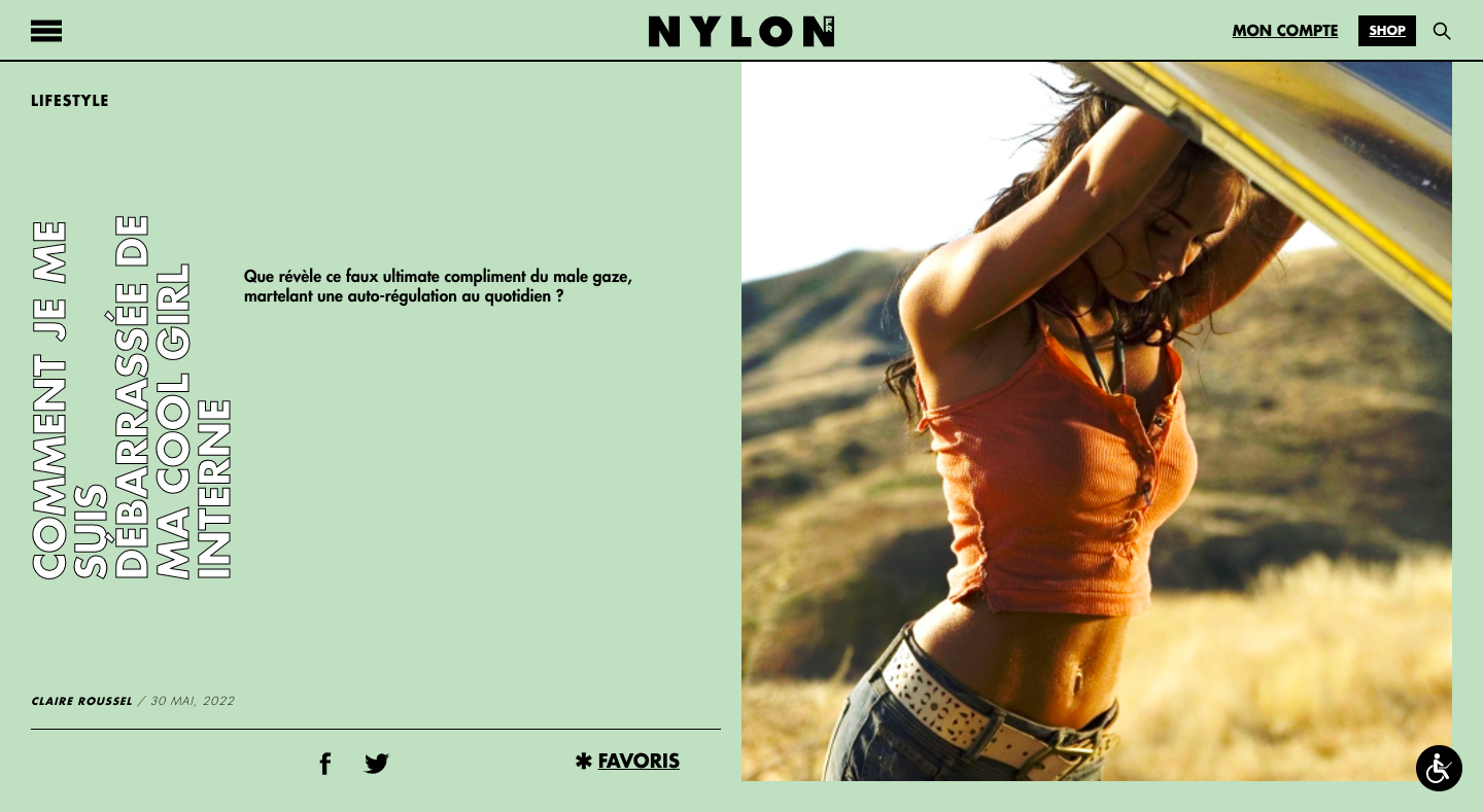 Nylon - Contributrice freelancePour cette nouvelle édition française du titre international de pop culture, j’ai rédigé un article de gonzo journalisme sur le syndrome de la Cool Girl, et comment ce mécanisme patriarcal avait affecté ma vie. Accéder au site →