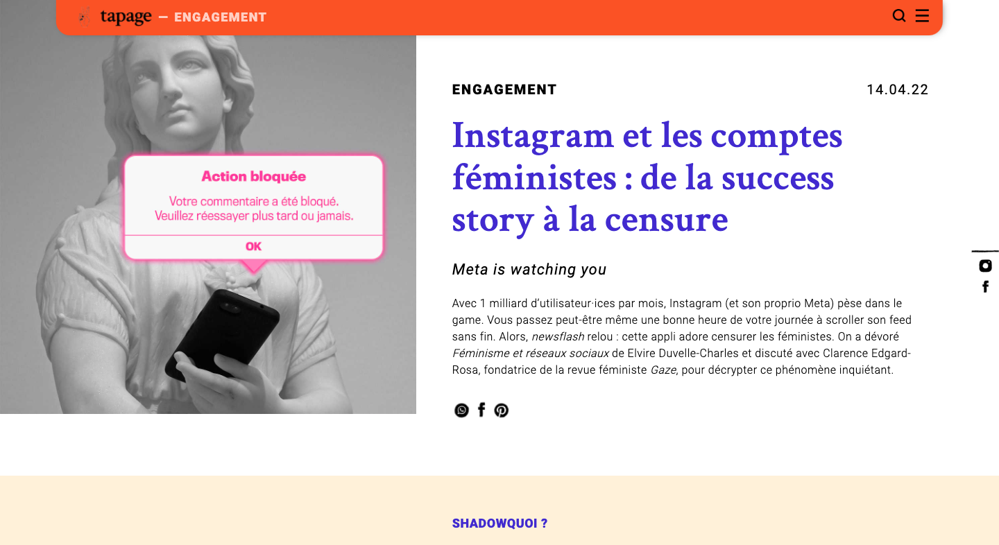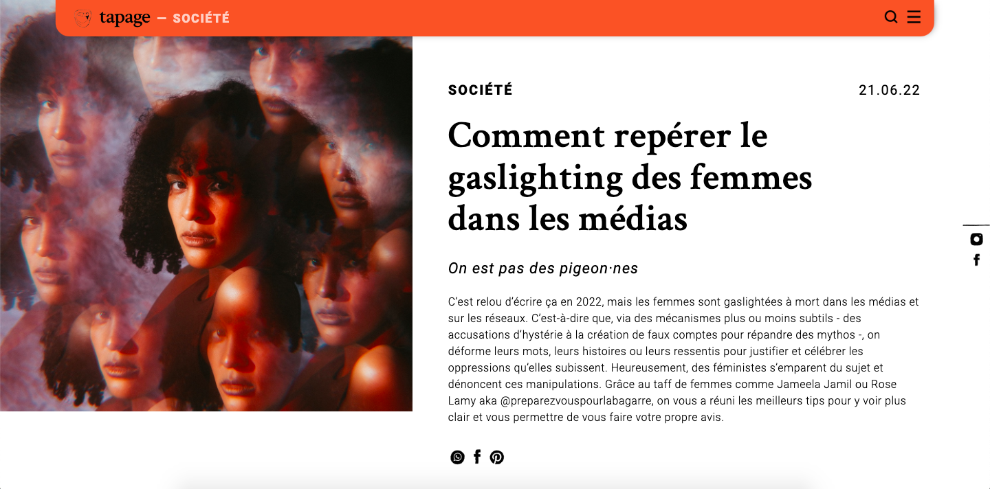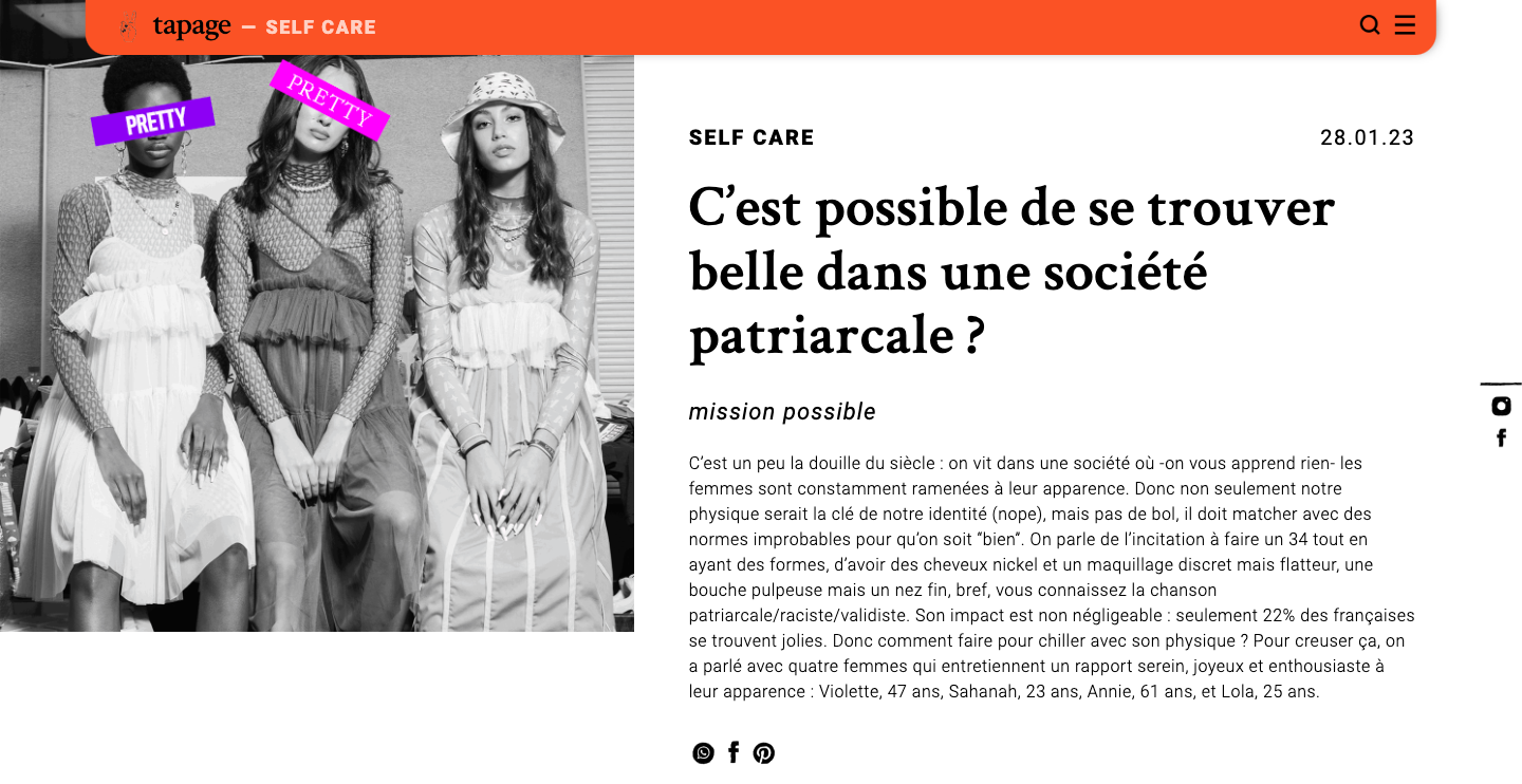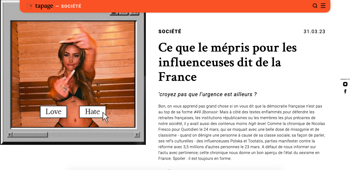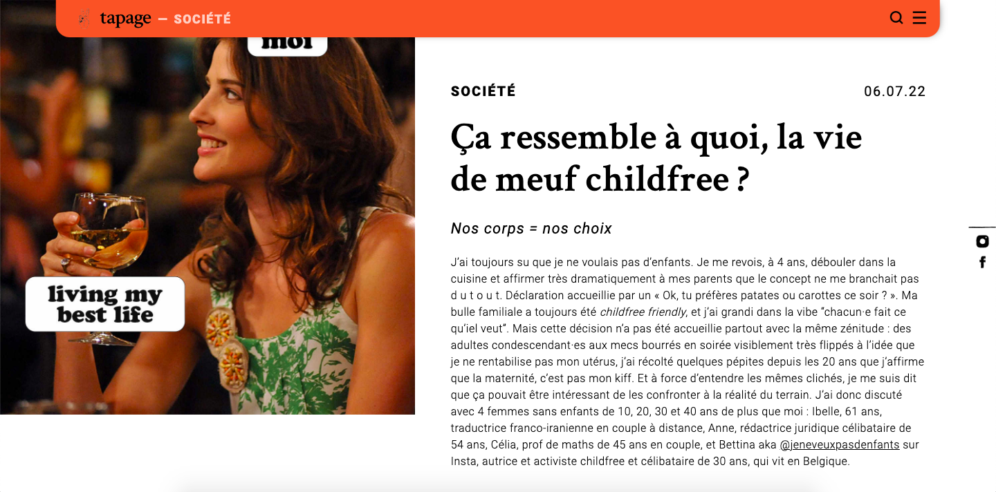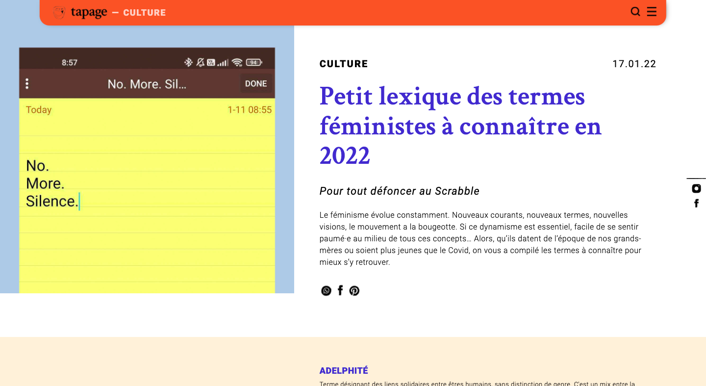 Tapage - Journaliste pigisteDepuis septembre 2021, j’ai écrit plus de 80 articles pour ce media digital portant sur les enjeux sociaux comme le féminisme, l’écologie ou la mode durable. Cette plateforme a pour but de faire circuler des idées engagées sur un ton léger et actuel. Pour Tapage, j’écris sur l’aspect sociologique des santiags, la vie des femmes childfree ou la censure des comptes féministes par Instagram. Accéder au site →