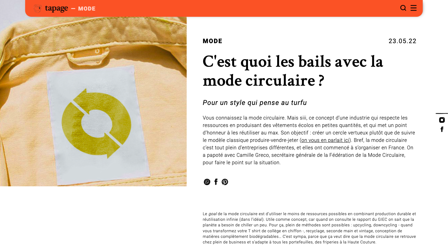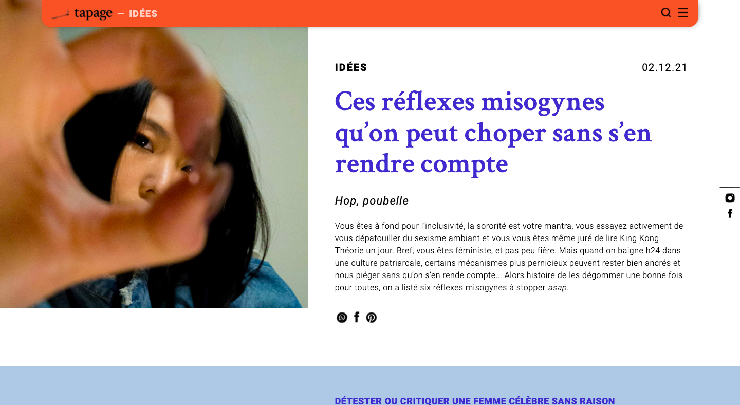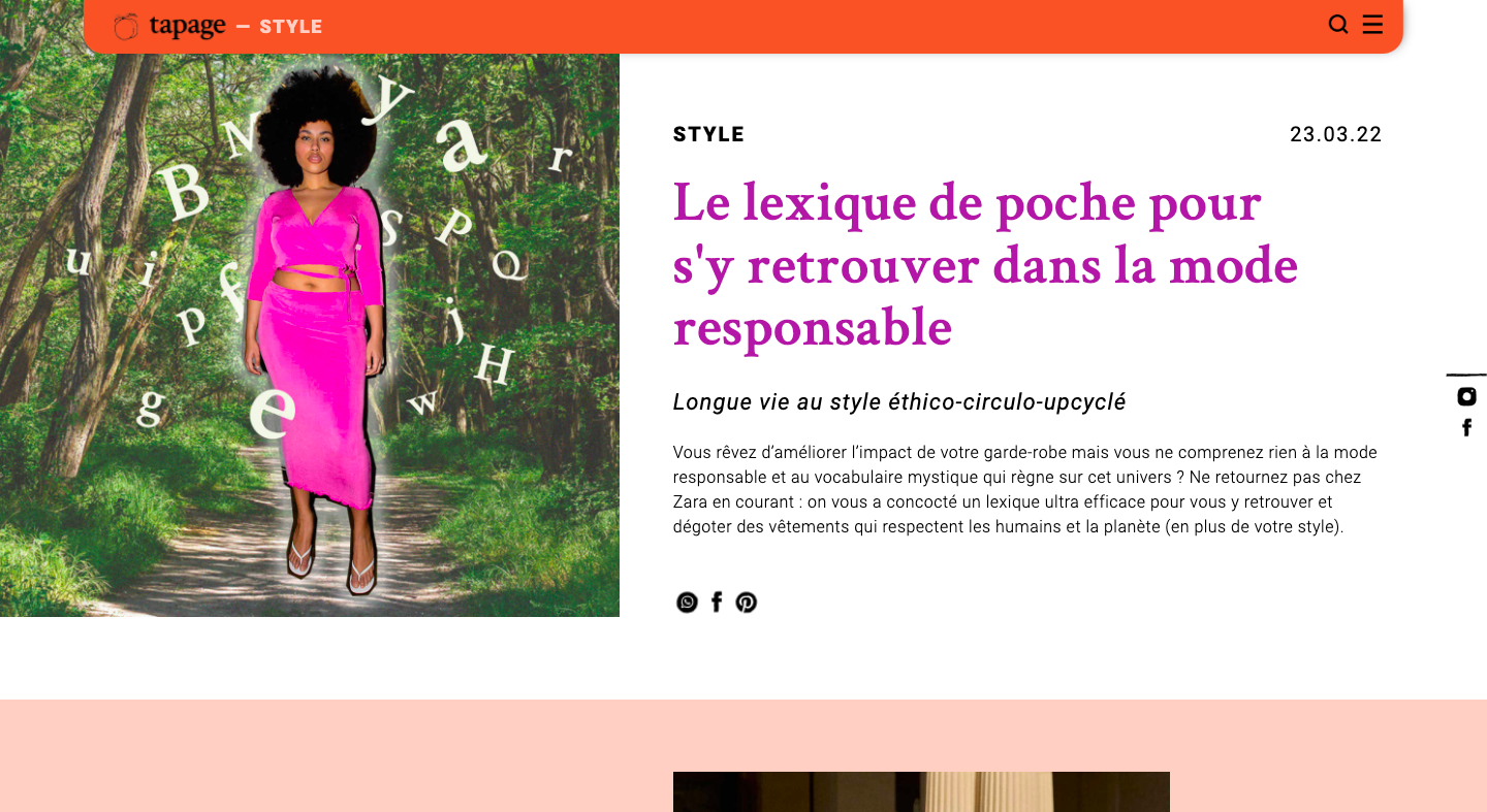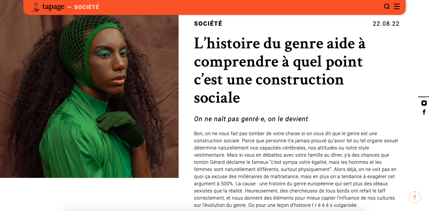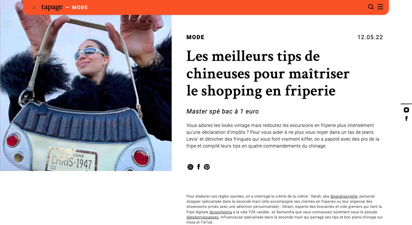 Tapage - Journaliste pigisteDepuis septembre 2021, j’ai écrit plus de 80 articles pour ce media digital portant sur les enjeux sociaux comme le féminisme, l’écologie ou la mode durable. Cette plateforme a pour but de faire circuler des idées engagées sur un ton léger et actuel. Pour Tapage, j’écris sur l’aspect sociologique des santiags, la vie des femmes childfree ou la censure des comptes féministes par Instagram. Accéder au site →