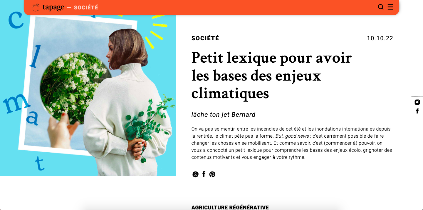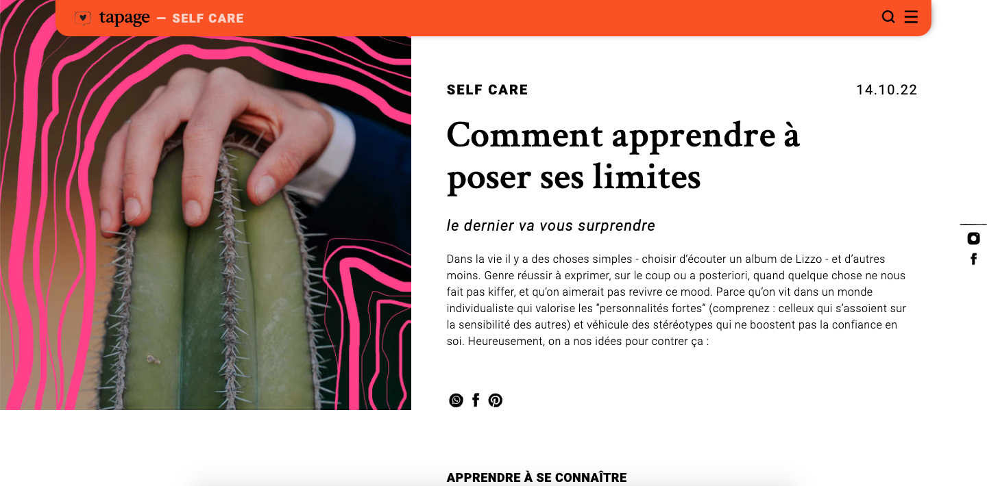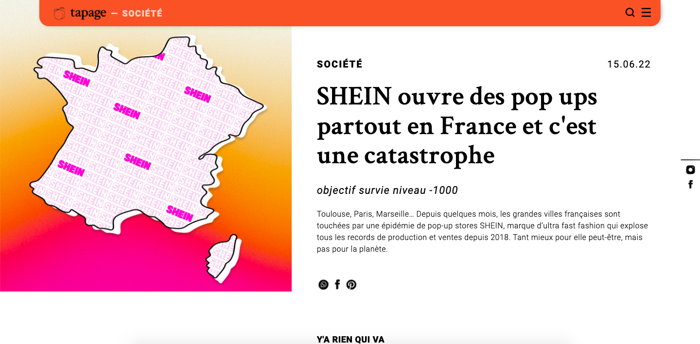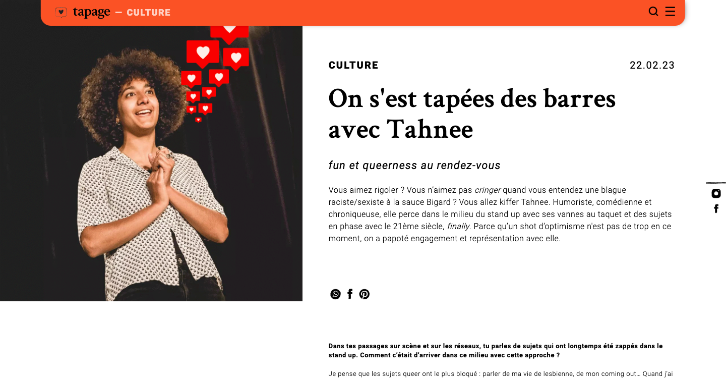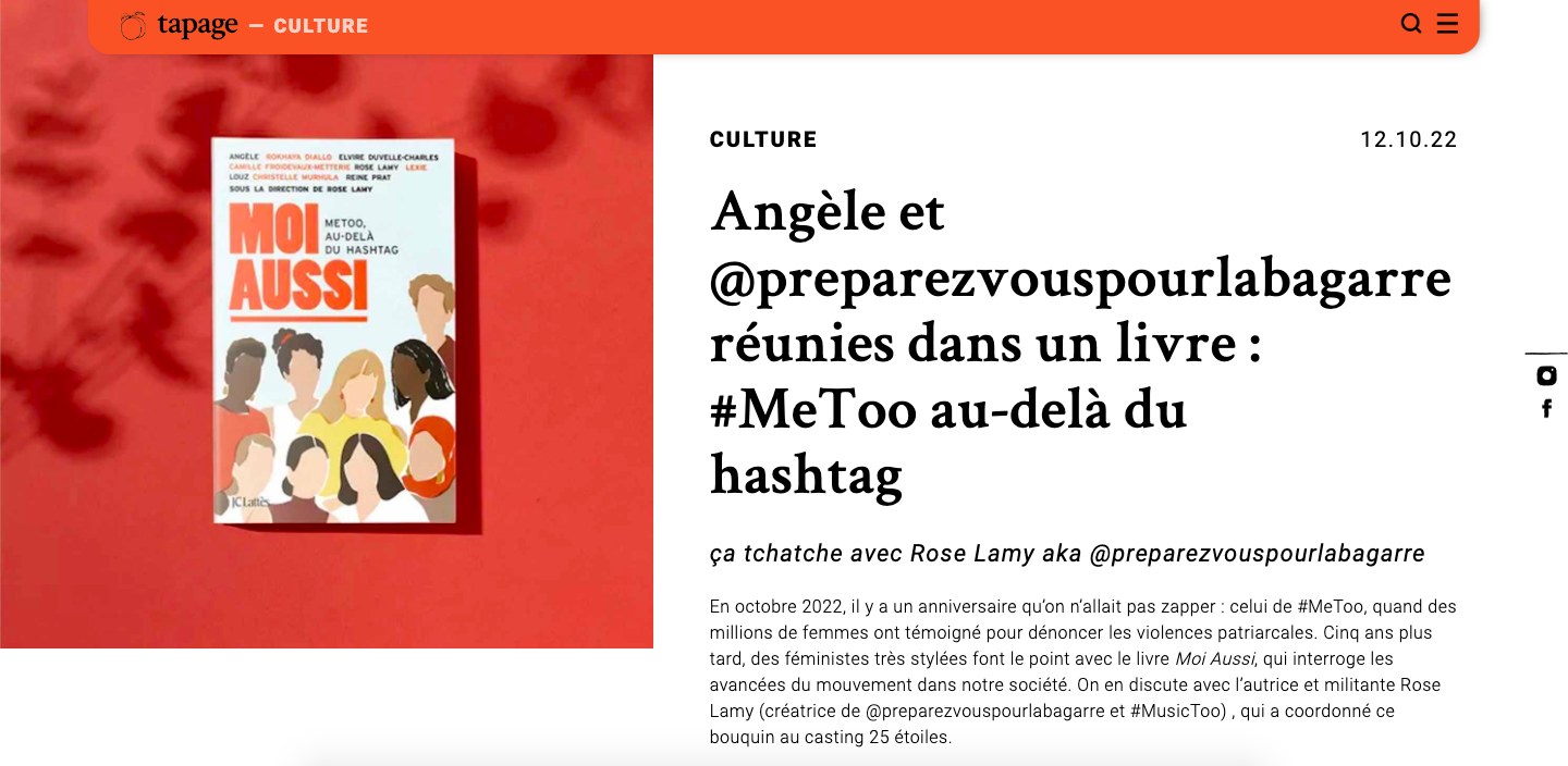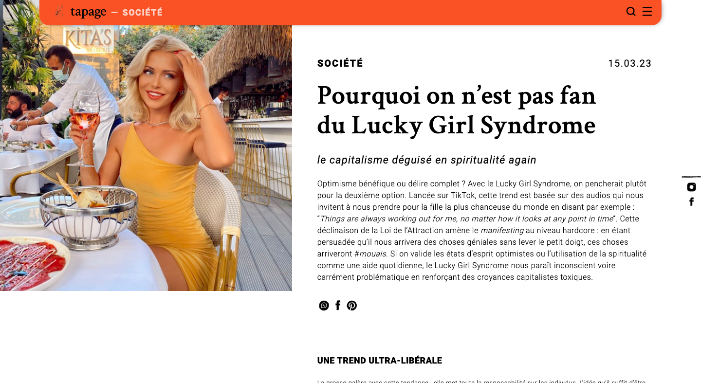 Tapage - Journaliste pigisteDepuis septembre 2021, j’ai écrit plus de 80 articles pour ce media digital portant sur les enjeux sociaux comme le féminisme, l’écologie ou la mode durable. Cette plateforme a pour but de faire circuler des idées engagées sur un ton léger et actuel. Pour Tapage, j’écris sur l’aspect sociologique des santiags, la vie des femmes childfree ou la censure des comptes féministes par Instagram. Accéder au site →