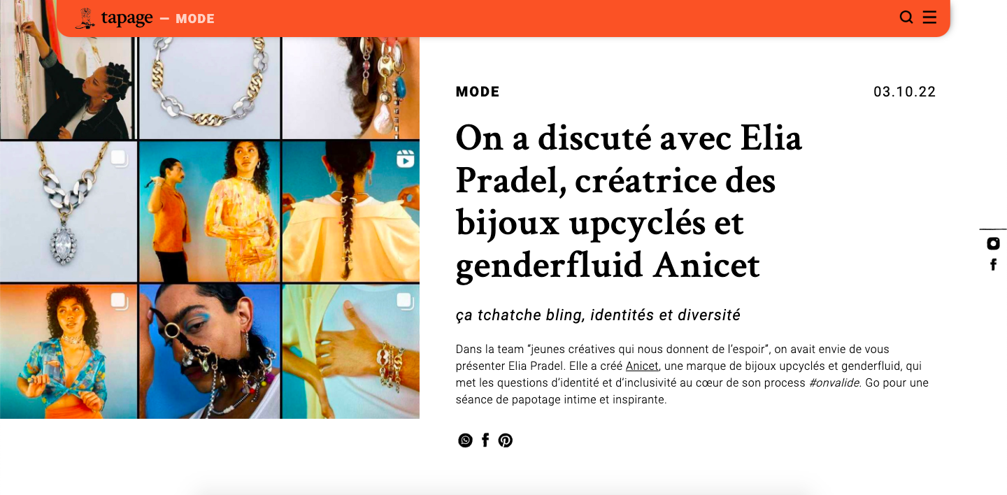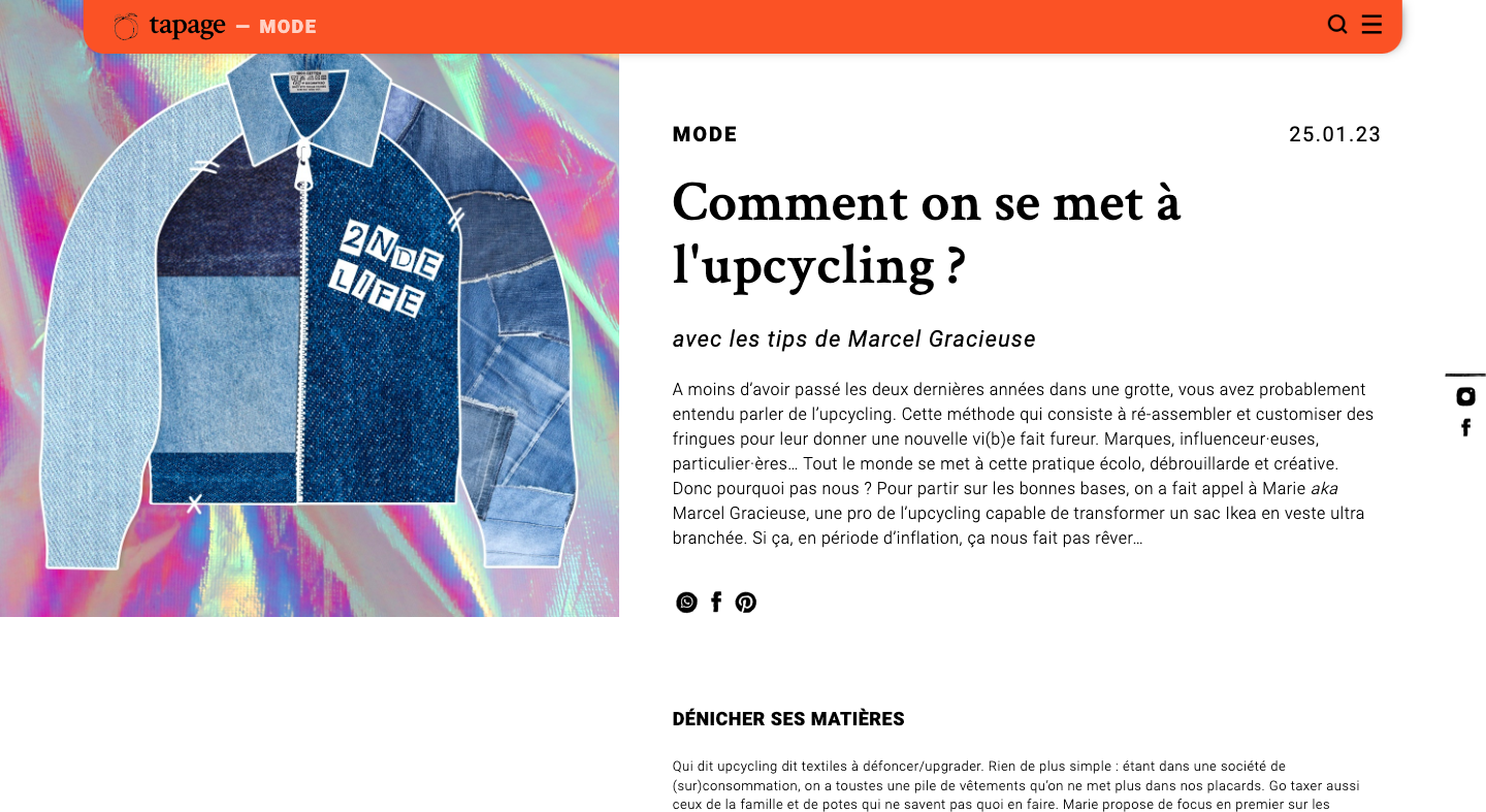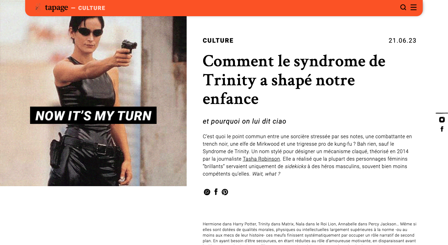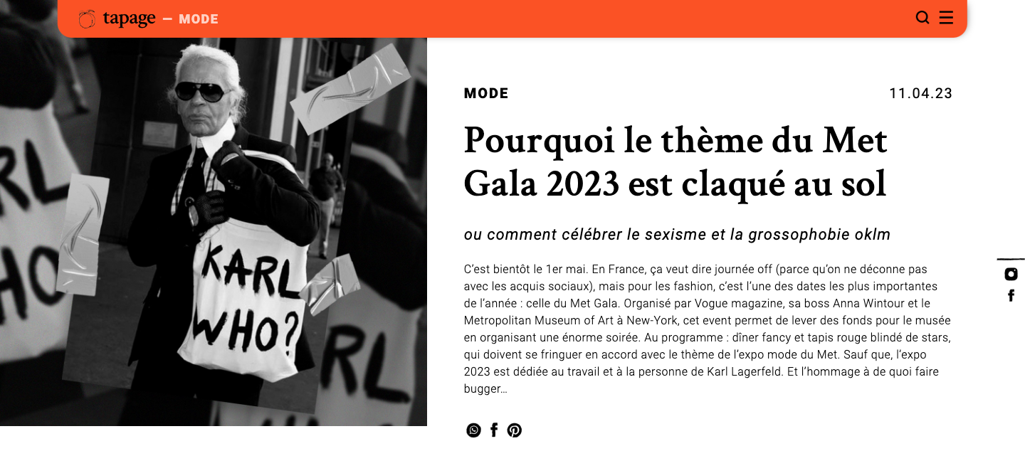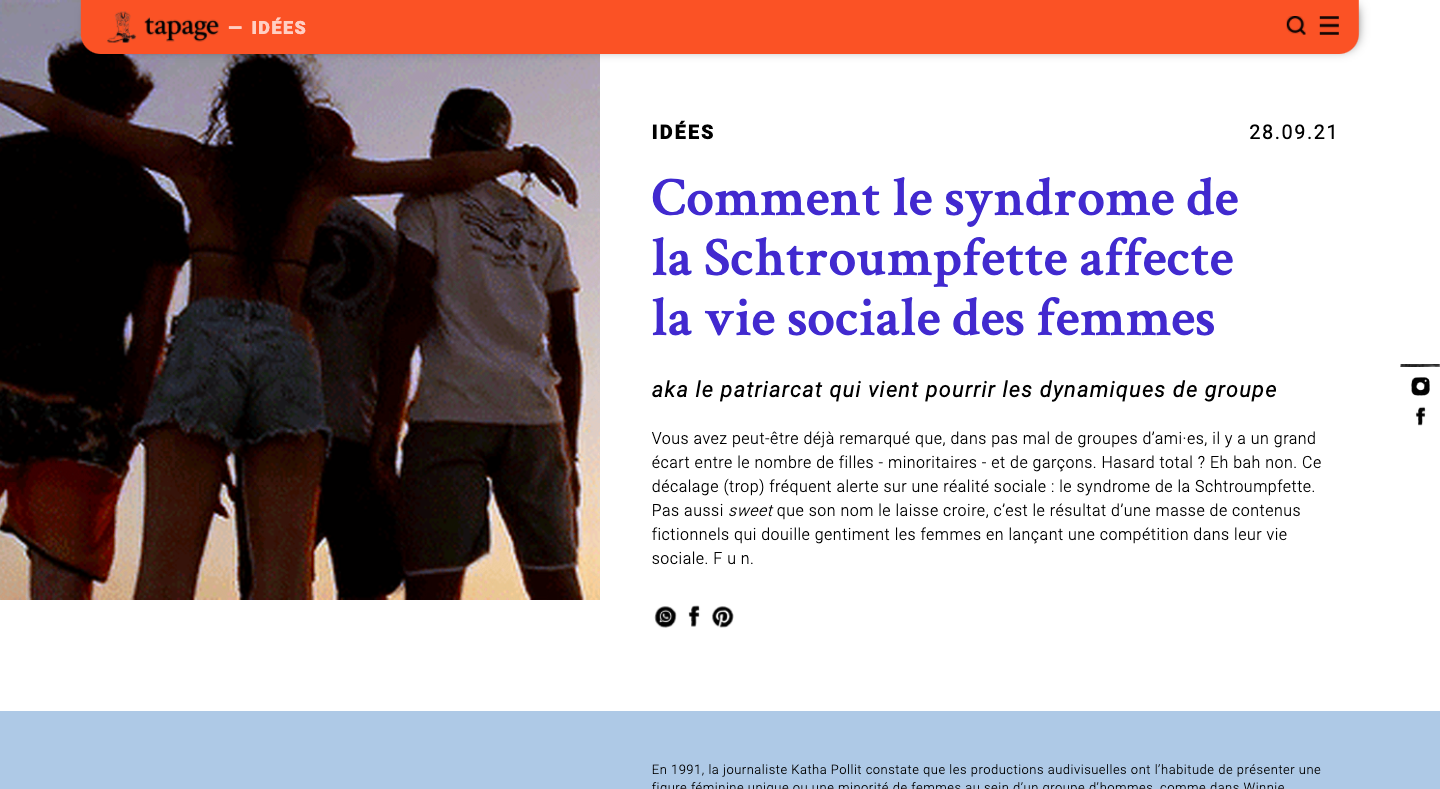 Tapage - Journaliste pigisteDepuis septembre 2021, j’ai écrit plus de 80 articles pour ce media digital portant sur les enjeux sociaux comme le féminisme, l’écologie ou la mode durable. Cette plateforme a pour but de faire circuler des idées engagées sur un ton léger et actuel. Pour Tapage, j’écris sur l’aspect sociologique des santiags, la vie des femmes childfree ou la censure des comptes féministes par Instagram. Accéder au site →