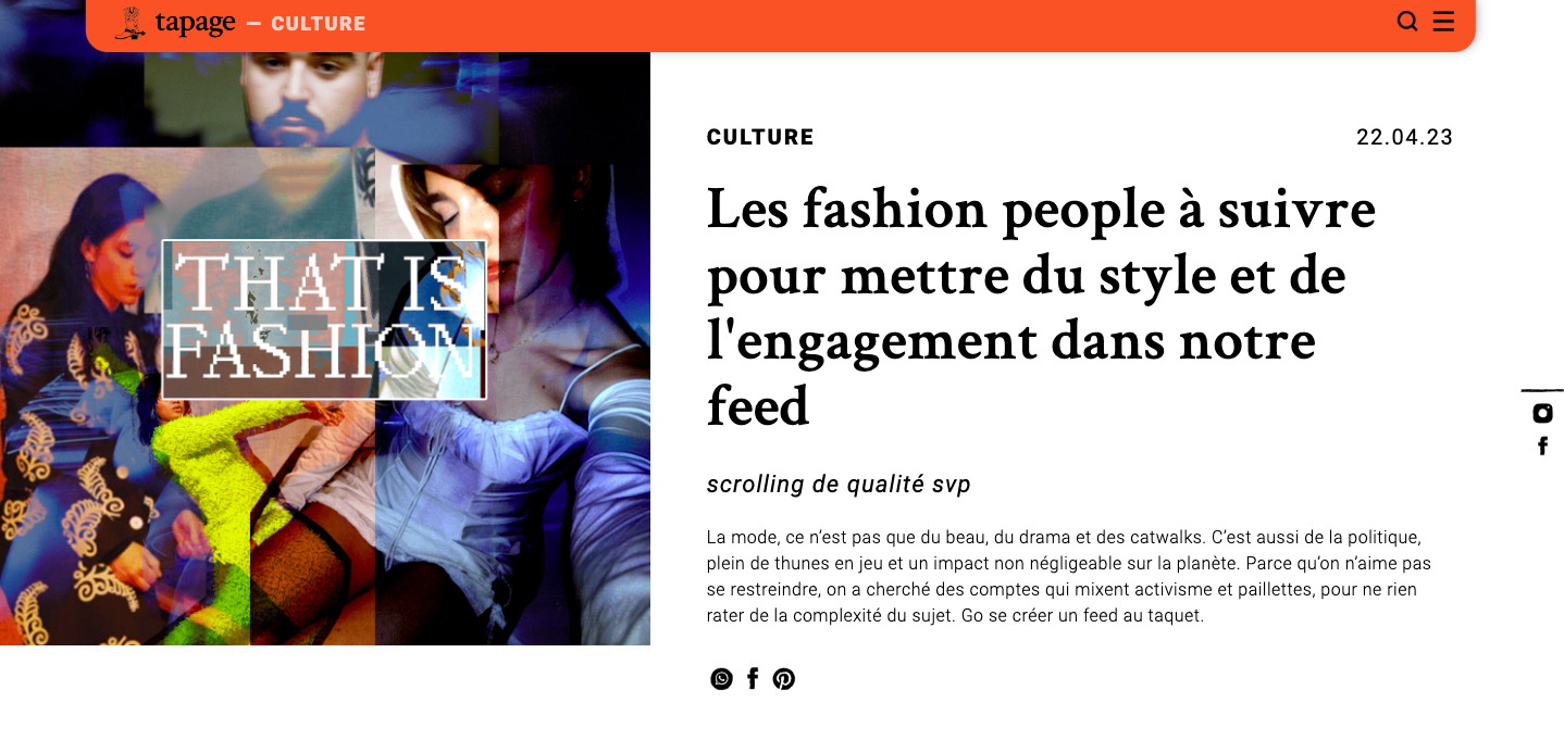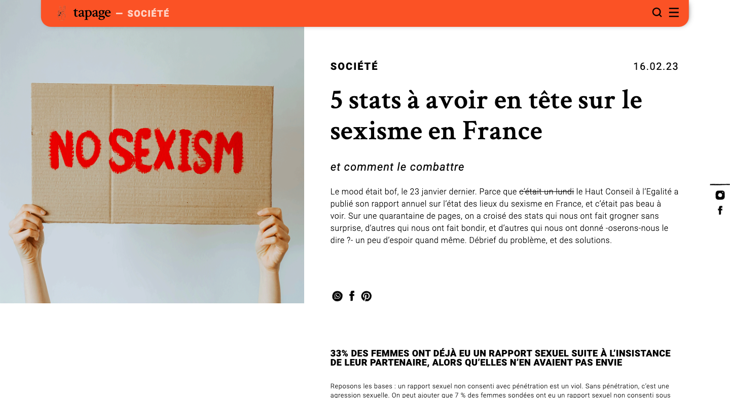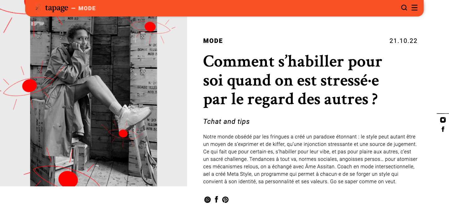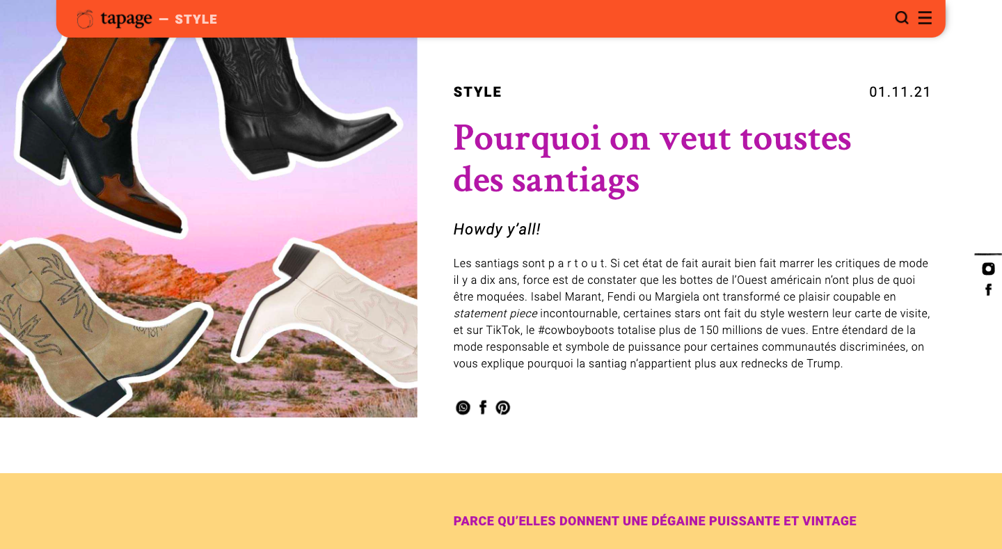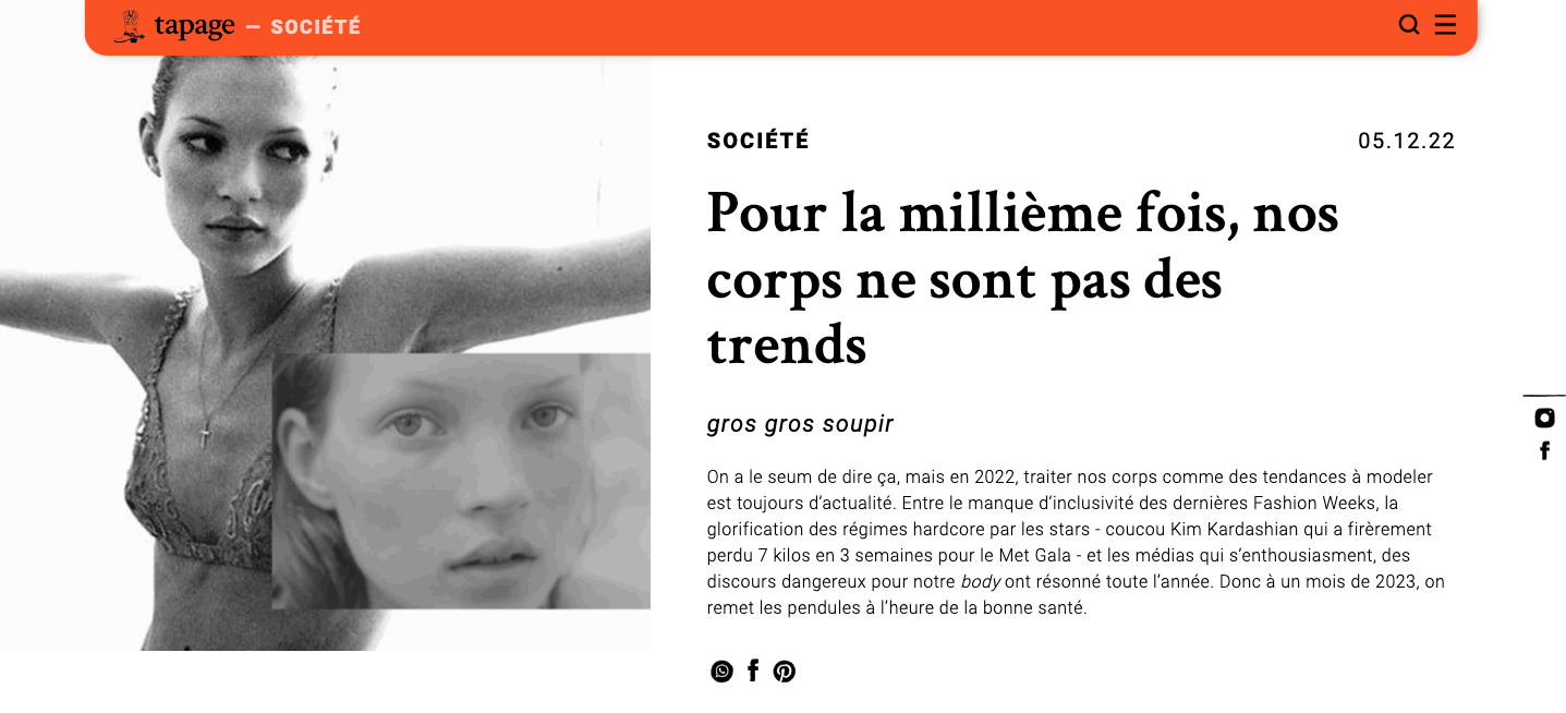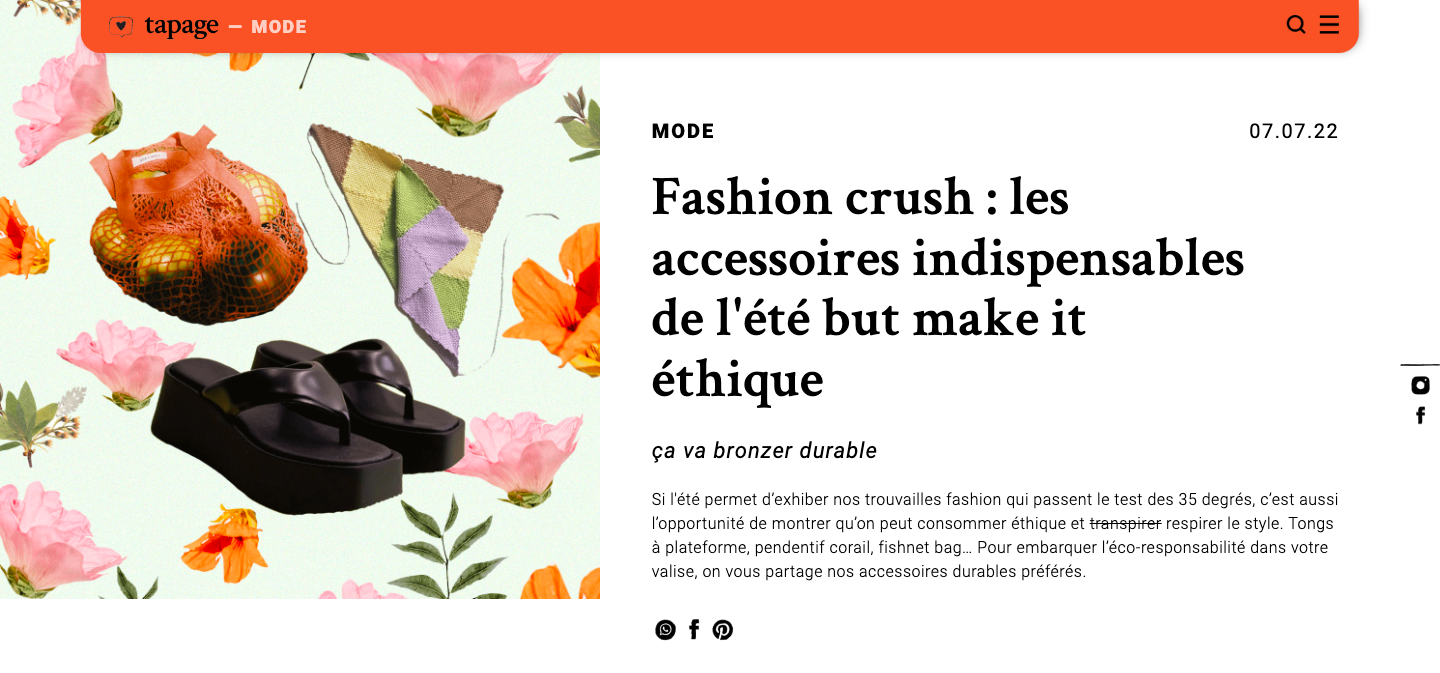 Tapage - Journaliste pigisteDepuis septembre 2021, j’ai écrit plus de 80 articles pour ce media digital portant sur les enjeux sociaux comme le féminisme, l’écologie ou la mode durable. Cette plateforme a pour but de faire circuler des idées engagées sur un ton léger et actuel. Pour Tapage, j’écris sur l’aspect sociologique des santiags, la vie des femmes childfree ou la censure des comptes féministes par Instagram. Accéder au site →
