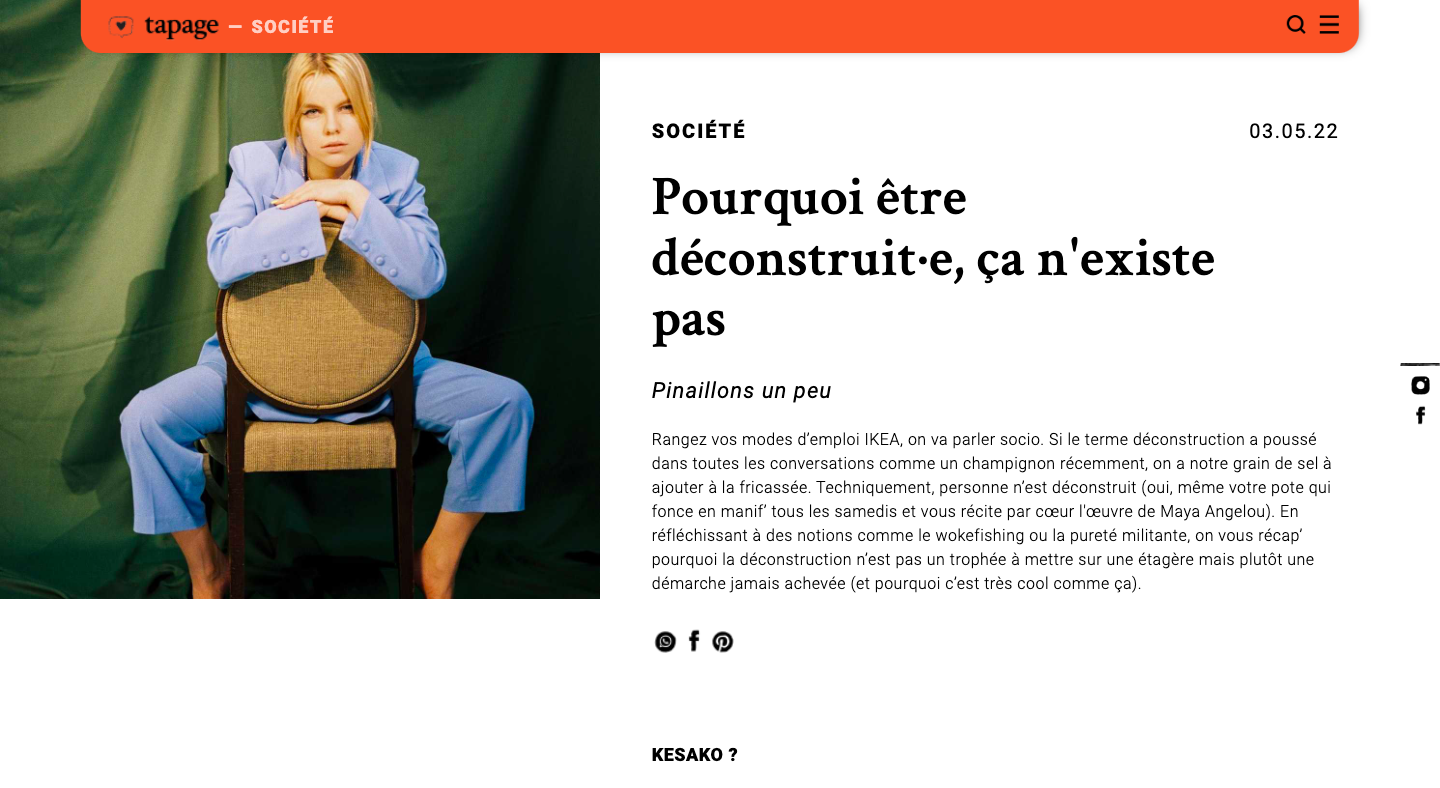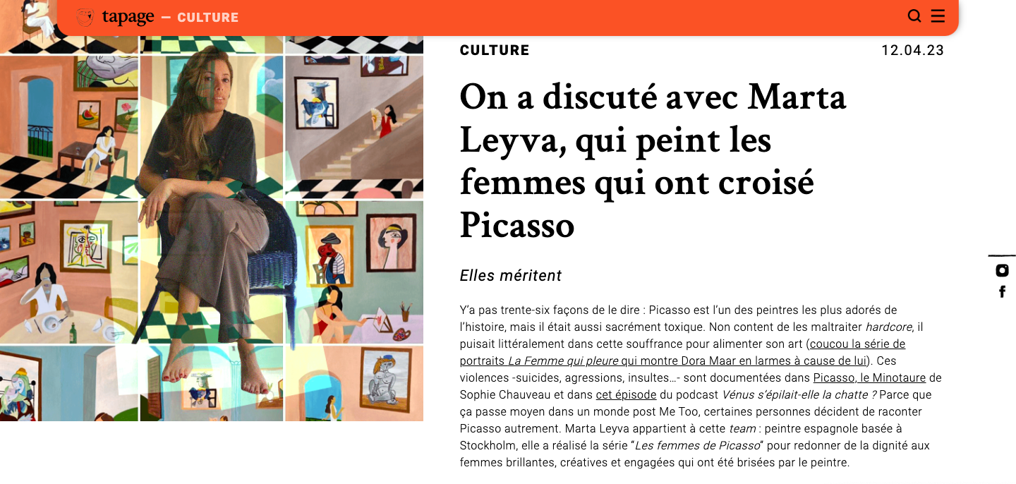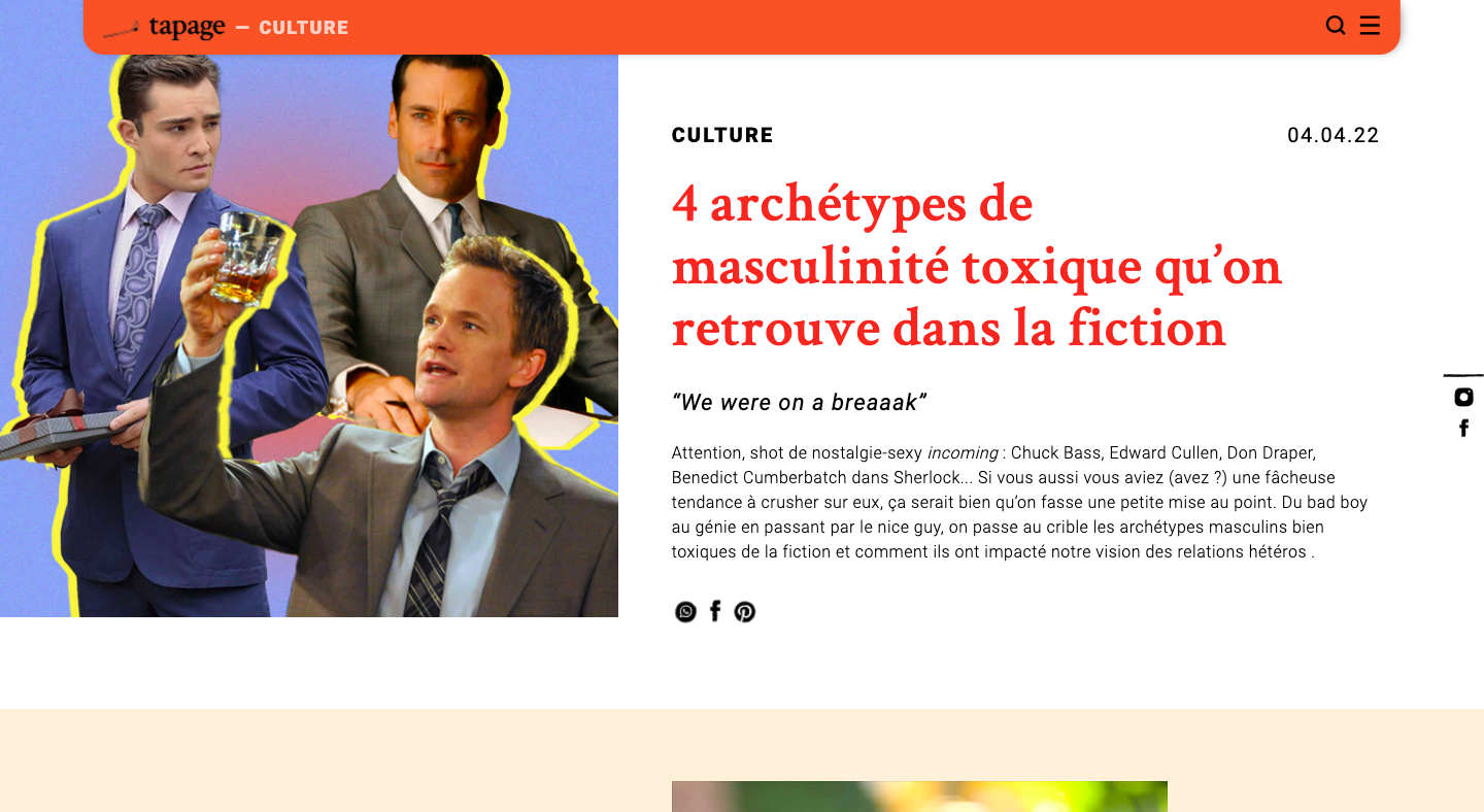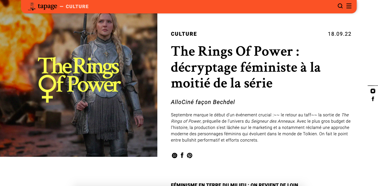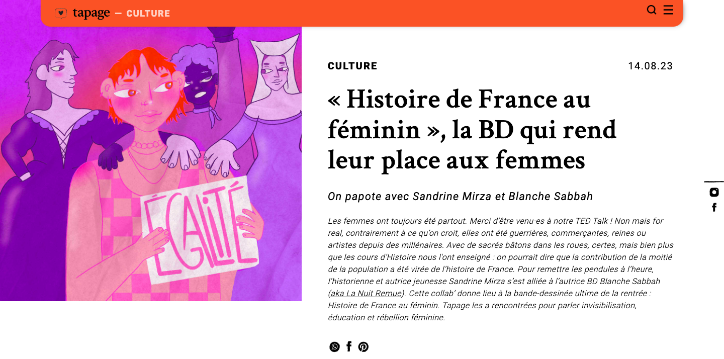Tapage - Journaliste pigisteDepuis septembre 2021, j’ai écrit plus de 80 articles pour ce media digital portant sur les enjeux sociaux comme le féminisme, l’écologie ou la mode durable. Cette plateforme a pour but de faire circuler des idées engagées sur un ton léger et actuel. Pour Tapage, j’écris sur l’aspect sociologique des santiags, la vie des femmes childfree ou la censure des comptes féministes par Instagram. Accéder au site →