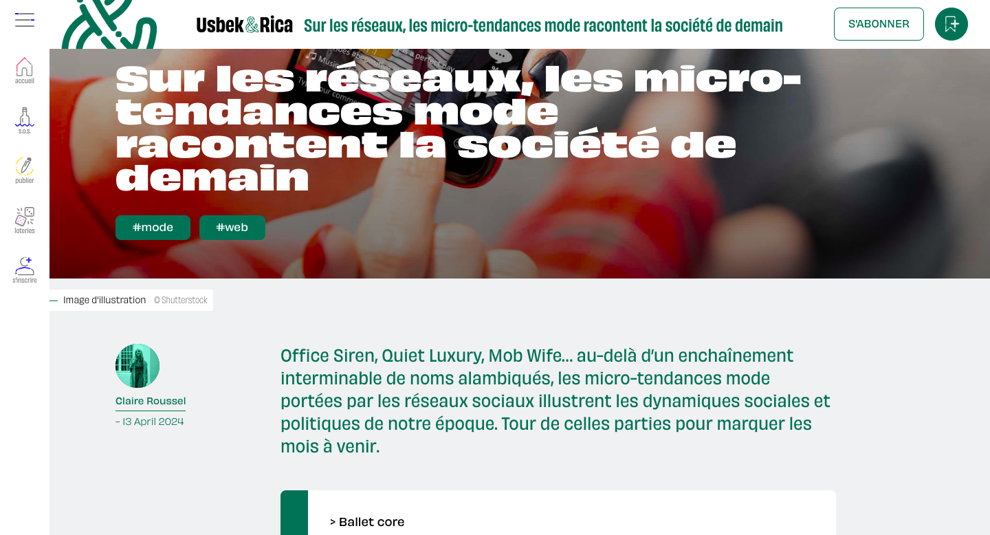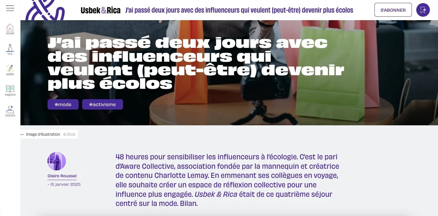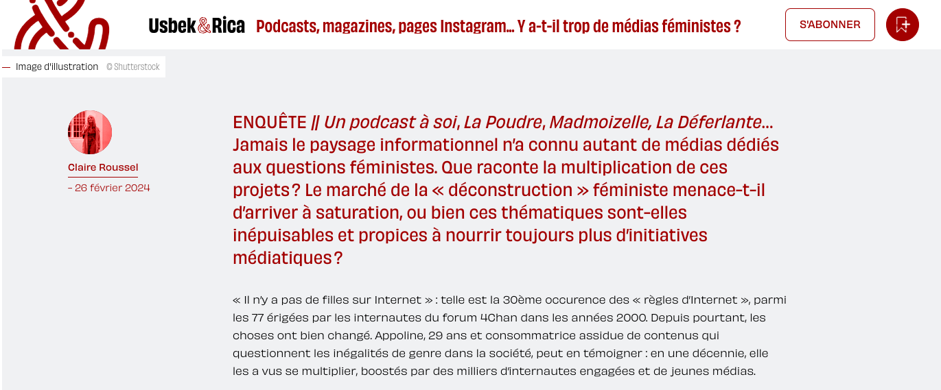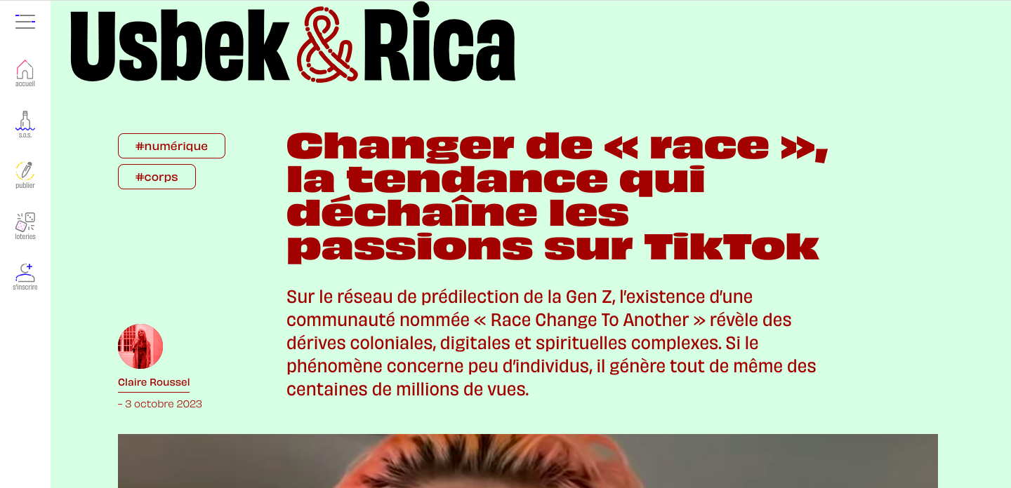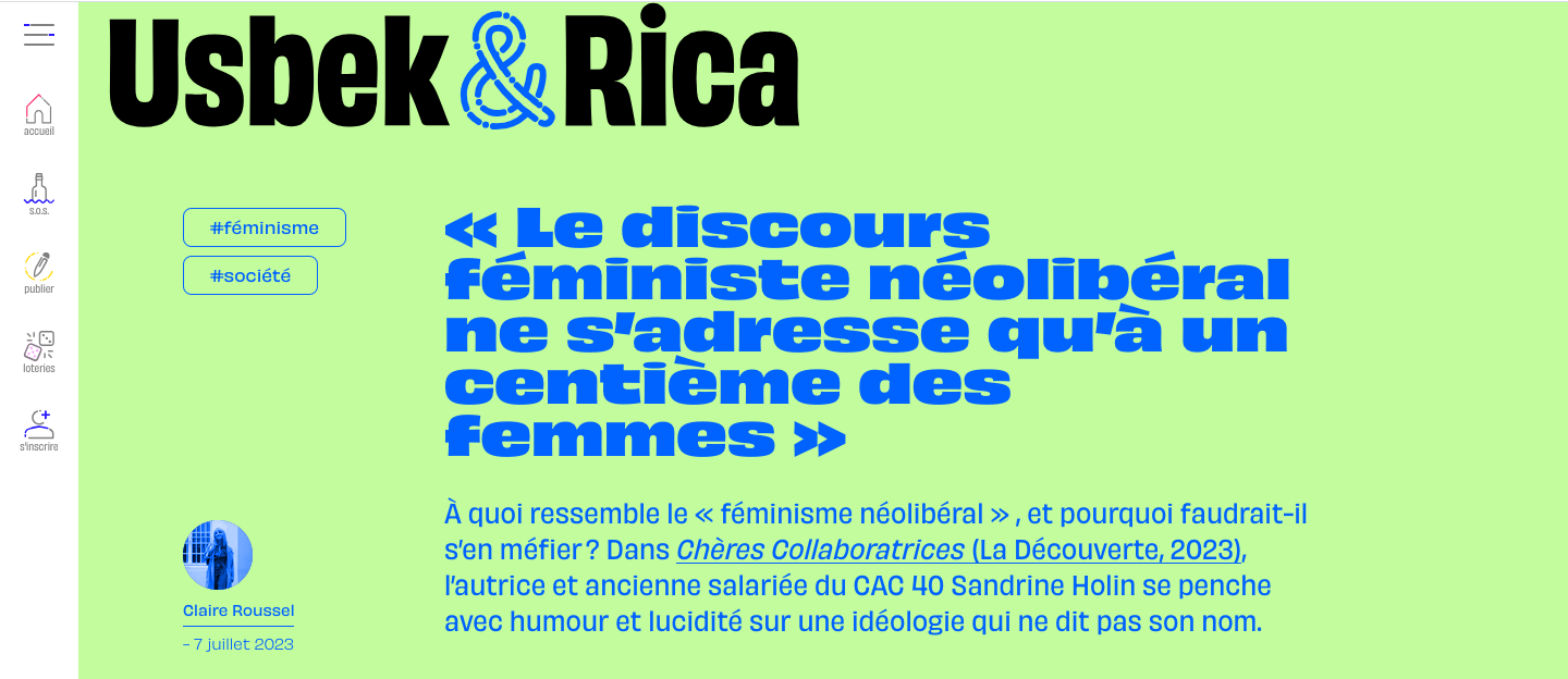Usbek & Rica - Journaliste Pigiste J’écris des articles liées aux tendances sociales, l’écologie et le néolibéralisme pour ce média qui explore le futur. Comme cette interview l’autrice Sandrine Holin sur les effets du néolibéralisme sur le féminisme, ou ce décryptage de la tendance “RCTA” sur TikTok. Accéder au site →